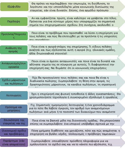 Ένα κοινό -αναλυτικό- πρότυπο επιχειρηματικού σχεδίου περιλαμβάνει, συνοπτικά, τις ακόλουθες ενότητες: